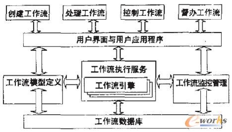 工作流程管理上要包括三個部分。工作流服務是整個系統的核心,工作流的模型定義與監控管理都同用戶相關聯,用戶通過應用界面及系統提供的功能定義工作流模型,監控管理工作流,軟件結構如圖3所示。該模塊屬即時性、基于數據庫并由任務驅動的工作流管理系統。為了提供良好的靈活性,適應工藝設計流程中的變動,用戶在模塊中自定義工作流,并允許用戶在運行過程中修改工作流,因此是即時的。工作流是根據用戶自定義的工作流程執行的,只有當前一個工作項完成后,后一工作項才被創建,因此是任務驅動的。