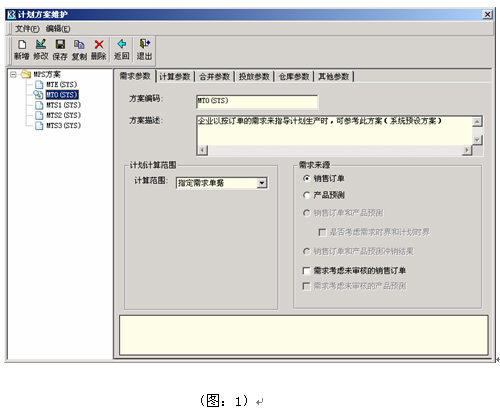 1) 在MRP計算時,計劃方案中選擇MTO,計算范圍為“指定需求單據”,需求來源為“銷售訂單”,如圖:1所示。然后選銷售訂單SO01進行運算,系統產生100PCS的LCC01的“計劃訂單”;