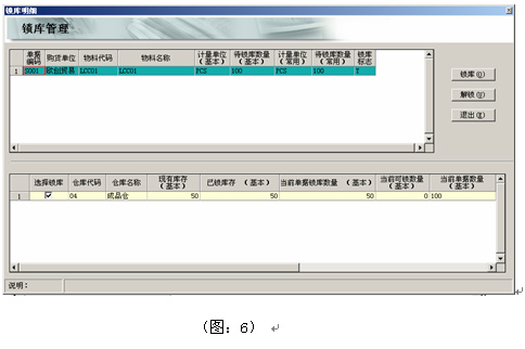5)首先通過鎖庫功能對銷售訂單SO01進行鎖庫處理,將生產任務單WORK000010已入庫的50PCS進行鎖庫(圖:6)
