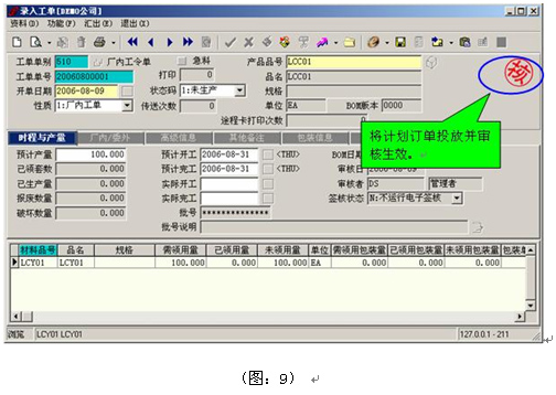 2)將該100個“計劃訂單”投放成“工單”,讓這張工單審核生效(圖:9)。