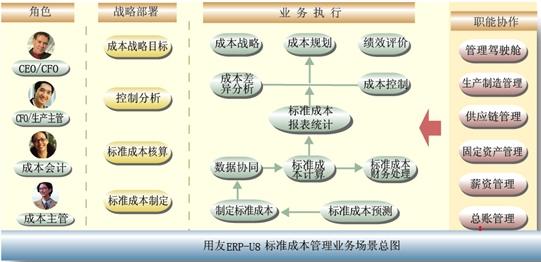 U8標準成本插件總體業務場景 隨著企業業務流程、管理基礎的日趨標準化,一些企業開始用標準成本法管理控制企業的生產成本,希望通過標準成本法量化并細化目標導向下企業各部門在經營發展中的工作成效。U8標準成本插件基于U8 成本管理系統開發,利用成本管理系統的基礎設置、數據錄入功能,新增標準成本制定、標準成本成本核算、憑證處理及相關報表,實現了完整的標準成本核算體系,在很大程度上滿足了采用標準成本進行財務核算的用戶的需求。本插件目前已經實現了生產訂單級的標準成本核算。