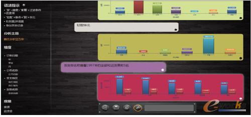 語音識別,互動操作展現易用性與智能性。將語音識別技術應用在BI上是用友華表的一大技術突破。除了鼠標、遙控器等操作工具,用友BQ企業駕駛艙實現了語音朗讀和語音查詢,通過這種易用的互動操作形式,讓用戶能夠更高效快速地獲取分析數據。語音朗讀功能解決了用戶作為決策者可能沒有太多時間集中精力看分析報告的情況,企業決策者可以一邊處理其他工作一邊聽語音報告。如果聽到中間有重要事務處理需要中斷,或者聽到重要章節要更加留意,還可以選擇暫停功能,中途也可以直接停止。語音查詢則是更重要的功能,用友BQ企業駕駛艙研發組長孔亮介紹,語音查詢并不是簡單的朗讀和語音錄入,而是涉及到將語音傳達的指令在后臺進行分析處理,以最快的速度將該指令以圖表的形式展現出來。企業可以根據自己的需要,定制出幾套數據模型,根據模型中的數據指標來隨意組合查詢。記者在現場演示中看到,語音輸入“按月查看1997年金額前三名”,企業駕駛艙可以根據語音中提到的幾個屬性“月”、“1997年”、“金額”、“前三名”來排列出每個月的前三名。并且還可以用語音命令其數據的展現形式,比如指令為“柱形圖”,便會以柱形圖的形式展示。除了交叉分析,企業駕駛艙還可以做深度鉆取。比如“鉆取華北”,就可以看到華北的數據,如果繼續“鉆取華北到產品類別”,即可看到華北區各類產品的數據。為了減少外界環境對語音識別的影響,用友BQ企業駕駛艙在設計時做了多方面考慮:為了防止系統將外界的聲音當成口令輸入,企業可以在正式輸入語音口令前按住一個按鈕,這時才會處于錄音狀態;為了提高語音識別的準確度,在識別時將語音進行錄制,然后做自然識別,把兩次對比的結果顯示出來,通過各種技術手段來提高識別率。