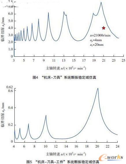 在加工實驗件所用翻板銑AEROSTAR 機床上,對φ 20mm 整體硬質合金銑刀進行錘擊實驗,在不考慮工件剛性的情況下得到顫振穩(wěn)定域曲線,如圖4 所示。