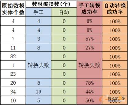 我們也在客戶B處做過Pro/ENGINEER轉換CATIA測試,對客戶提供的10組模型中,其中有3組在Pro/ENGINEER導出成STEP個后,CATIA無法打開。另外7組可以正常打開,但是有2組模型打開后零件完全破損。另外的5組零件的破損率從27%到75%不等,這個時候如果在CATIA打開,只能在CATIA中對破面進行修補,所花費的時間會很長。中間格式轉換和ASFALIS轉換對比情況見下圖: