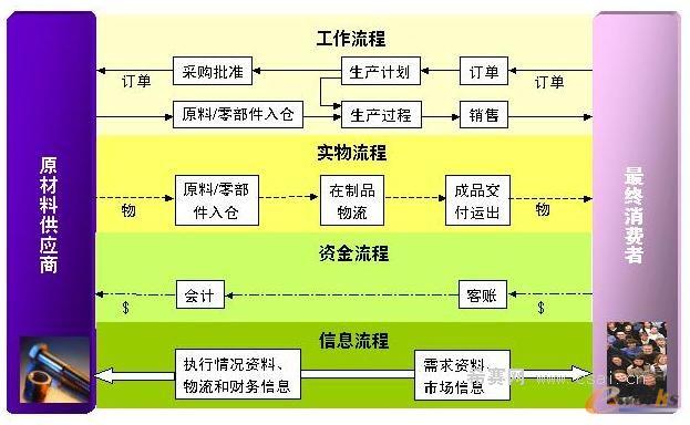 供應鏈的信息流程帶動工作流程,工作流程決定實物流程,實物流程反饋為資金流程。