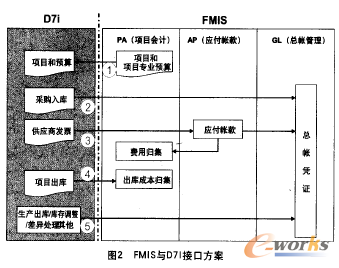 綜上所述,FMIS與D71的接口方案如圖2所示,其中:①-項目及預算從F}VIIS中導人到D71;②D71采購接收事務自動產生會計總帳憑證導人FMIS;③-D71發票接收事務自動傳遞到FMIS的應付、總帳,并進行費用歸集;④-D71中的項目出庫事務自動產生會計憑證導人FMIS,并進行項目成本歸集;⑤-D71中的其他出庫事務、庫存調整和差異處理等自動產生會計總帳憑證導人FMIS.