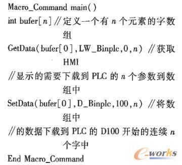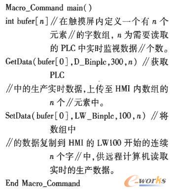 實現參數上傳的方式為:在HMI中建立讀取參數宏,并使該宏一直處在激活狀態,讀取參數宏的功能是將各工藝參數上傳至HMI的實時數據監視存儲區。這樣,遠程PC機讀取HMI中實時監視存儲區的數據,即可安全、方便地讀取現場生產實時信息。其讀取參數示范宏指令如下: