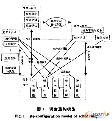DRERP系統(tǒng)中的多Agent重構(gòu)機(jī)制采用了合同網(wǎng)和啟發(fā)式規(guī)則相結(jié)合的協(xié)調(diào)方式來實(shí)現(xiàn)調(diào)度規(guī)則和策略的重構(gòu).該系統(tǒng)的資源調(diào)度重構(gòu)模型如圖 1所示.在此模型中,調(diào)度Aegtn將生產(chǎn)計(jì)劃細(xì)化后生成任務(wù)Agent,并生成一個(gè)任務(wù)計(jì)劃,同時(shí)將有關(guān)信息告知任務(wù)Agent,消息內(nèi)容的格式為:{作業(yè)名稱,單位作業(yè)的基本任務(wù),任務(wù)所需資源表,期限,其他約束,任務(wù)標(biāo)識(shí)}.