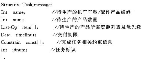 例如,當(dāng)有新訂單計(jì)劃發(fā)生時(shí),調(diào)度Agent:通過用戶接口接收新訂單,然后通過與其他Agent (銷售Agent生產(chǎn)計(jì)劃Agent、物供Agent、庫存Agent、采購Agent等)接口進(jìn)行信息交互,經(jīng)過成本Agent進(jìn)行核算分析以及重構(gòu)Agent確定的資源重構(gòu)方案后(對(duì)機(jī)車產(chǎn)品零部件組成進(jìn)行樹狀結(jié)構(gòu)劃分后,系統(tǒng)規(guī)定產(chǎn)品關(guān)鍵部件,如轉(zhuǎn)向架、內(nèi)燃機(jī)等的優(yōu)先級(jí)最高),產(chǎn)生一個(gè)基本的生產(chǎn)流程計(jì)劃和資源調(diào)度計(jì)劃,并自動(dòng)生成一個(gè)任務(wù)Agent,連同"生產(chǎn)任務(wù)消息"發(fā)送給任務(wù)Agent.以下給出Agent間業(yè)務(wù)交互的2個(gè)消息格式.其中,生產(chǎn)任務(wù)發(fā)布消息格式為: