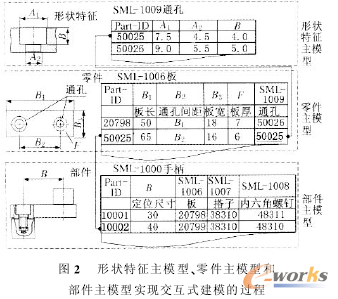 零部件主模型由零部件幾何模型及相應事物特性表組成。在事物特性表中利用事物特性和導出特性來描述零部件外型和尺寸之間的聯系.只要在主模型中輸入一組數值.就可以通過幾何模型自動地派生出零部件的一個變型實例。按照對象的不同.可以將零部件主模型分成型狀特征、零件和部件二個層次。圖2描述了組成部件手柄的型狀特征主模型、零件主模型和部件主模型實現交互式建模的過程.其中.SML-ID是零部件類事物特性表分類碼.主要用于對產品和零部件進行分類.向開發人員和管理人員提供有效的分類檢索手段.并且它能夠通過指針將構成產品主結構的零部件主模型之間的相互關系關聯起來;Part- ID是識別碼.用于對同一類零部件中不同對象進行區分和標識。這種二個層次主模型之間層層調用的型式及其相互間的聯系反映了產品主模型的實質。這種建模方法的最大優點是.當某一個主模型的實例發生變化時.與之相關的零件模型或部件模型也立即發生相應改變。這種功能對于ETO產品的定制設計是非常重要的.因為有時在進行變型設計時.只需要修改極少數零部件或型狀特征的事物特性數值.就可以自動得到定制產品的全部技術文檔。所謂主文檔是各種模板的總稱.如主圖、主工藝過程規劃和主NC程序等.它們是在主模型的基礎上建立起來的.