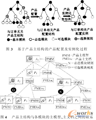 在理論上.產品主結構完整地表達了產品的各種組合變型.其中產品基型是由基本模塊組成的層次結構.而其他產品組合則是通過在產品基型基礎上添加可擴充模塊來實現的。因此.產品主結構是一個與評單無關的、可配置的、包括所有基本模塊和可擴充模塊的模塊化產品系統。可擴充模塊一般包括必選模塊和可選模塊.各種模塊之間的相互約束關系及選擇可以利用配置規則加以描述.并把各種規則按照簡單的方式羅列在決策表里.存放在配置知識庫中.這樣就能夠表示相關聯的IF-THEN聯系事物特性表描述了主結構中各種基本模塊和可擴充模塊以及它們之間所有可能的組成關系。產品事物特性表的各種表列不僅對其功能、幾何等事物特性進行了描述.而且還可以利用SML- ID分類碼指向組成該產品主結構的不同零部件主模型的事物特性表。如圖3所示.在產品快速設計過程中.基于產品主結構的配置過程可以分為兩個步驟:①根據產品主結構和客戶需求.通過配置設計得到與評單相關的近似產品結構集.即結構設計;②在此基礎上.可以利用零部件主模型通過變型設計確定各定制零部件實例.即詳細設計.從而得到符合特定評單的產品結構及其相關文檔。圖4說明了經過簡化的產品主結構與各零部件主模型主文檔之間的聯系。產品A1是由部件A2,A3以及可擴充零件P1,P2,P3,P4,P5尸構成的產品主結構;每個零部件都對應著一個產品主模型.部件主模型是由零件主模型構成的。主模型之間的連線與產品主結構一樣說明了零部件各層次主模型之間的聯系。產品主文檔則是在產品主模型的基礎上建立起來的