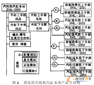 工業汽輪機是一種技術密集型產品.汽缸是其重要組成部件.它們的最大特點是必須按照客戶需求定制.是典型的ETO產品.需要面向MC的配置設計和變型設計相結合才能夠實現產品的快速定制。根據基于產品族的模塊化原理.可以將汽缸分為前驅段、減壓段、延氏段、過渡段、法蘭段和排汽段6個標準區段.每個區段又分為上、下兩半段.分別建立其主模型。圖6表示了經過簡化的汽輪機汽缸本體主結構(配置模型),每個模塊都具有對應的事物特性表.如汽缸本體的事物特性表分類碼為SML-2000.前驅段上半段的事物特性表分類碼為SML-2001.表中每一行通過標識碼保存著己有的成功實例.零部件之間的事物特性表通過指針進行關聯。其中前驅段和排汽段為必選模塊.前驅段有常壓和高壓兩種模塊;減壓段為依賴性模塊.當選擇高壓前驅段模塊時必須選擇;過渡段和延氏段為可選模塊.可以根據汽輪機轉子通流部分進行多種組合,R為存放于決策表中的配置規則。