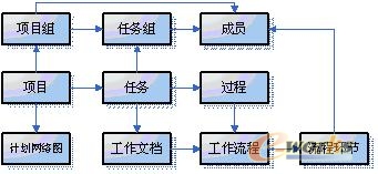 項目管理是一種為了在確定的時間范圍內,完成一個既定的項目,通過一定的方式合理地組織有關人員,并有效地管理項目中的所有資源(人員、設備等)與數據,控制項目進度的系統管理方法。為了實施一個項目,需要執行項目規劃、制定進度計劃、過程監視和分析等步驟。作為PDM系統的項目管理模塊,它主要是圍繞企業產品的開發設計來組織項目的。一個項目往往需要分解成幾個任務,而一個具體的任務又由它包含的若干個工作文檔來確定。項目對象需要利用任務對象和工作文檔對象來確定項目的結構。為了項目的順利進行必須組織開發團隊進行協同工作,因此一個項目還應該有項目組、項目負責人、項目成員等對象。項目、任務、工作文檔對象可以與一個項目日歷對象相關聯,以便進行項目的實際進度和目標進度的比較。其中工作流的作用是對整個產品的形成過程進行控制,實現參與項目人員的協同控制,提高效率。項目的實施包含一個完整的過程鏈,該過程鏈包括開發、試驗、生產等各個階段。工作流模塊不但可以應用于整個產品的過程鏈,而且還可以與項目的每個任務進行關聯。任務中的每一個工作文檔執行完相應的流程后,任務才可以進行提交驗收的工作。工作流程不但明確了一個工作文檔的執行程序,還把流程中的每一工作環節的工作任務分配給特定的項目組或任務組的成員。項目管理的概念模型圖如圖2所示。