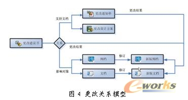 工程變更是生產過程中經常出現的重要活動,在一個企業中,工程變更往往有規范的過程約束與流程控制,所以它與工作流管理總是密不可分的。工程變更管理是指對已發布(歸檔)的產品設計和開發結果的變更。必須先由更改申請人員提出更改請求,并填寫相應的設計更改建議書,提交有關人員會簽通過后,最后才能交由更改人員完成設計文件的更改。整個工程變更流程由設計更改建議書來驅動,本企業的設計更改管理業務流程和更改關系的模型分別如圖3和圖4所示。
