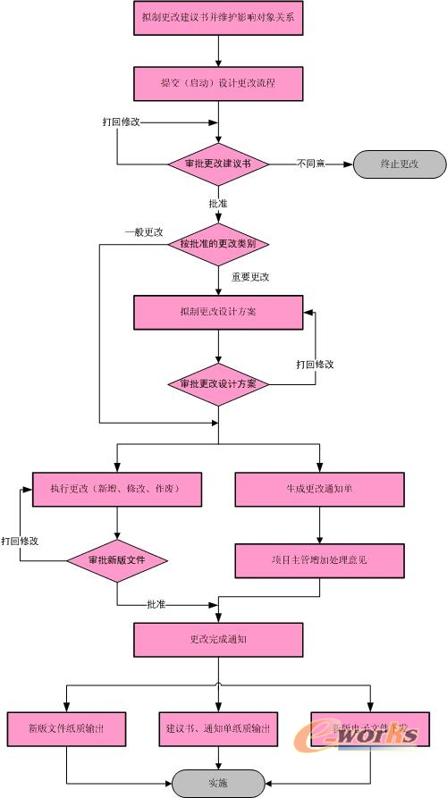 工程更改過程本身就是一個特定的工作流,它有申請、評審、實施、通知更改等幾個基本環節,而這幾個基本環節又包含了更詳細的步驟。如對更改建議書的會簽必須確定會簽的人員,通過對更改建議書的審批,然后進行簽發。同時,被更改的設計文檔必須與設計更改建議書建立關聯關系,在設計更改建議書會簽完成的同時獲得設計文檔版本升級的權限,并自動將升級后的文檔提交相應的流程。如果更改過程產生了新的設計文檔,也需與更改建議書建立關聯關系,在建議書的審批完成后驅動新文檔的審批流程。相應的更改通知單由PDM系統自動生成。