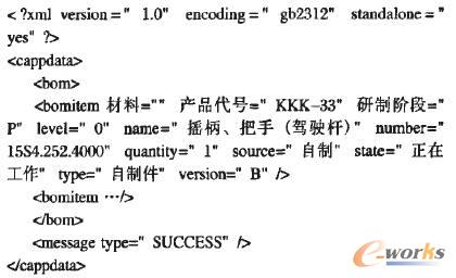 CAPP與PDM之間主要交換的數據是結構化的物料清單表,XML提供了一種結構化的數據表示方式,使得數據與結構分離,所以選擇XML作為中間格式并通過SOAP協議傳遞來實現CAPP與PDM之間的數據交換。CAPP可以從PDM中得到設計結構樹和設計節點屬性,PDM則可以從CAPP中得到工藝BOM和裝配BOM。下面給出用于傳遞產品結構樹(EBOM)數據格式的例子:
