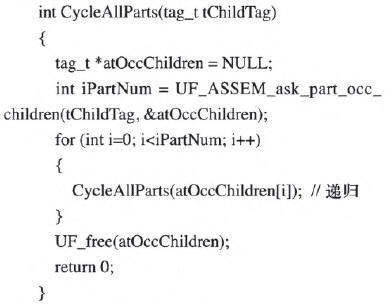為了獲取總成中所有節點的信息,需要遍歷總成的整個裝配結構。常用的遍歷方法有深度優先法與廣度優先法兩種,本系統采用深度優先法,深度優先法遍歷裝配結構的基本算法如下:首先獲取裝配結構的根節點,然后獲取根節點的子部件。對每個子部件遞歸求解下一級子部件,如此循環,直到子部件為單個零件。以下是實現遍歷裝配結構功能的代碼。