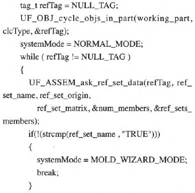 在NX注塑模環境下,有些零件中存在多個用于輔助建模的實體,在計算零件備料信息時,系統需要找到零件的真正實體,本系統通過使用True和False引用集來區分零件的真正實體和輔助實體。因此為了正確計算出零件的備料尺寸,首先判斷是否存在True引用集。具體實現代碼如下: