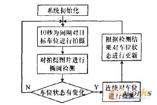 對(duì)系統(tǒng)的狀態(tài)進(jìn)行初始化后,經(jīng)橢圓檢測后對(duì)停車位設(shè)置一個(gè)標(biāo)志位,每次當(dāng)車位變化的時(shí)候,改變?cè)摌?biāo)志位。即每次對(duì)車位狀態(tài)進(jìn)行判斷的時(shí)候,首先將結(jié)果與系統(tǒng)中保存的狀態(tài)進(jìn)行比較。當(dāng)檢測結(jié)果發(fā)現(xiàn)狀態(tài)變化時(shí),不能簡單的更改車位的狀態(tài),需要進(jìn)行多次檢測(5次),并且不再以10秒為單位進(jìn)行判斷,而是每次檢測完就直接拍攝下一張圖片判斷,通過統(tǒng)計(jì)對(duì)檢測結(jié)果判斷車位是否有變化,以防誤判。