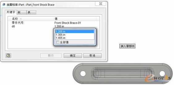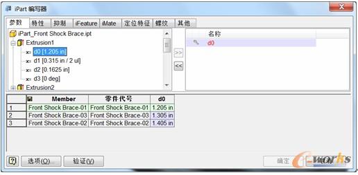 在這個例子中,我們設定參數d0為需要改變的目標參數,三個序列的值分別為:1.205in,1.305in,1.405in。用戶添加了成員(Member)之后,對不同成員的不同參數設定不同的值。INV就能夠通過這張表驅動參數改變零件的幾何形狀。