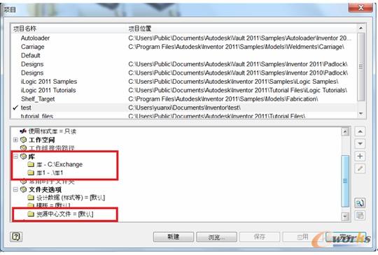 INV的一個特色就是具備了非常完整的標準零件庫,具體的安裝路徑能夠在項目中修改。在INV的項目管理界面中,有兩個跟庫有關的的方,已經在下圖中標出來了。
