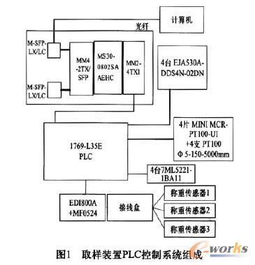 該控制系統主要由硬件和軟件兩部分組成,其中硬件包括:MS30交換機一套、羅克韋爾PLC一臺(共有8個1769一IQ32數字量輸入模塊,5個1769一IF8模擬量輸入模塊,3個1769.OV32T數字量輸出模塊,所用保留備用I/O點的比例都在30%以上)、壓力、溫度、重量變送器以及其他輔助元件、常規電氣元件等。軟件主要采用羅克韋爾公司的工控軟件,包括通訊軟件RSlinx,編程軟件RSLogix5000,組態軟件Factory Talk View SE,通過硬件和軟件相結合,實現數據自動采集并保存,運用組態畫面能夠實現對整個系統的手動和自動兩種控制方式,取樣裝置PLC控制系統原理組成,現場試驗,控制系統實際接線分別如圖1、圖2和圖3所示。