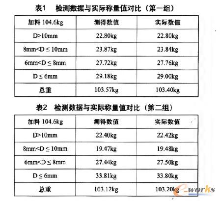 為了驗證通訊是否成功以及組態畫面中數值的顯示值與實際值是否一致,把控制系統中稱重料斗中的物料分別取出來再在另外的電子稱重設備上進行二次稱重,與原來的數值進行比對,兩次分別加入104.6kg的物料,粒度分為四種:D>10mm,8mm<D S 10mm,6mm<D 1 8mm,D S 6mm,其中D為物料的直徑。兩組數據對比如表1、表2所示。