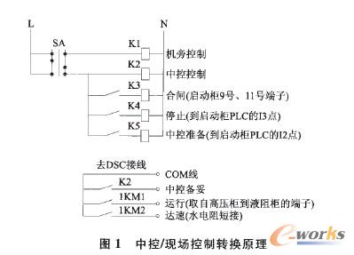 在操作臺內增加一個可選擇中控/現場及分合閘控制的回路(見圖1),將繼電器K1~K5觸點按控制原理與PLC進行連接。這樣,操作臺即可以通過轉換開關SA的切換來選擇由中控還是機旁來啟停,而且兩種開機方式均可實現主機設備的連鎖與安全保護。