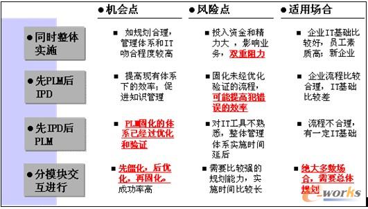 在以上三個前提條件下,兩個系統的建設可以分步進行。建議在用PLM系統固化產品開發流程之前,首先參照IPD研發模式定義總體產品開發流程框架,包括產品開發流程以及該流程和其它流程,比如技術開發流程、產品規劃流程之間的接口關系等等。對PLM而言,一些局部的模塊,比如產品設計和模塊構建(CAD、CAE等)、項目管理、溝通交流等,可以獨立建設,但是要考慮并預留和PLM系統中其它模塊的接口,每個模塊既要相互獨立,但又不能孤立。