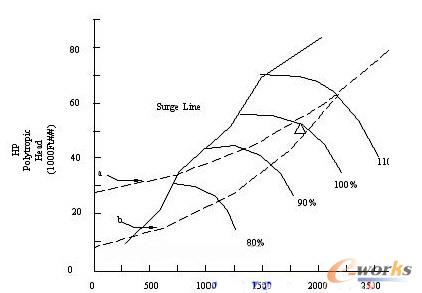 GM 離心鼓風(fēng)機(jī)的性能是非線性的曲線,其性能的檢測(cè)來(lái)源于溫度傳感器,壓力變送器,流量變送器等檢測(cè)元件,就GM離心鼓風(fēng)機(jī)性能曲線來(lái)講,在機(jī)組流量和壓力調(diào)節(jié)過(guò)程中存在著喘振區(qū)和安全區(qū)(非喘振區(qū))。機(jī)組不允許在喘振區(qū)工作,故對(duì)機(jī)組控制的第一要求就是將其控制在安全區(qū),即做好防喘振控制。而多種控制方式是耦合在一起的PID回路,所以要達(dá)到控制要求,就必須解耦,使機(jī)組工作在安全區(qū),即不喘振。所謂喘振:如圖1,a和b虛線是管路阻力曲線,當(dāng)改變流量和壓力時(shí),機(jī)組會(huì)在某區(qū)域造成管路急劇產(chǎn)生壓力和氣流的激烈的脈動(dòng)和振動(dòng),運(yùn)轉(zhuǎn)變得不穩(wěn)定了,將這種現(xiàn)象叫做喘振。
