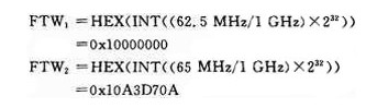 頻率調(diào)諧字是AD9957在單音頻工作模式下,實(shí)現(xiàn)信號調(diào)制的重要參數(shù)。對于中心載頻為63.75MHz,碼速率為5Mb/s的MSK調(diào)制系統(tǒng),假定AD9957的內(nèi)核時(shí)鐘為1GHz,其兩個(gè)載頻62.5MHz和65MHz的頻率調(diào)諧字(FTW)分別為: