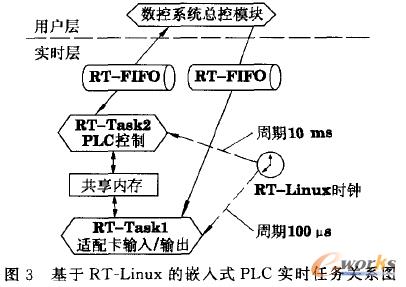如圖2所示,數(shù)控系統(tǒng)的PLC控制模塊實(shí)時(shí)性要求較高,因而必須在系統(tǒng)的實(shí)時(shí)域內(nèi)運(yùn)行。根據(jù)通用數(shù)控系統(tǒng)的PLC控制以及數(shù)控系統(tǒng)軟件模塊化設(shè)計(jì)的要求,將數(shù)控系統(tǒng)的PLC控制模塊作為RT-Linux系統(tǒng)的實(shí)時(shí)任務(wù)之一,其優(yōu)先級(jí)和調(diào)用周期取決于數(shù)控系統(tǒng)各任務(wù)的實(shí)時(shí)性要求以及控制要求的響應(yīng)時(shí)間。PLC控制模塊主要完成數(shù)控系統(tǒng)的邏輯控制,而被控制的輸人/輸出也就是I/O的輸人/輸出由光纖通信適配卡輸人/輸出模塊來完成,即完成數(shù)控系統(tǒng)的PLC控制需要2個(gè)RT-Linux實(shí)時(shí)任務(wù),如圖3所示,這2個(gè)任務(wù)分別為RT-Taskl(以下稱“適配卡輸人/輸出”)、RT-Task2以下稱“PLC控制”)。