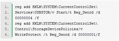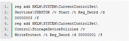 其中,第一行代碼可以將優盤設置成禁用狀態,第二行代碼可以讓用戶訪問優盤的權限恢復到默認狀態。