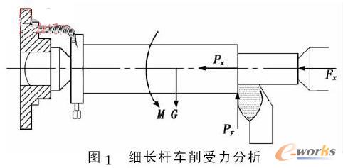 細長桿車削受力分析如圖1所示。加工過程中,細長桿件所受的外力主要有切削力(軸向切削力Px、徑向切削力Py及切向切削力Pz)、自身重力G、旋轉產生的離心力、軸向頂力Fx,這些力共同作用,導致桿件產生彎曲變形。桿件變形的最直接后果是產生振動,從而影響工件的圓柱度和表面粗糙度。一般來講,工件彎曲越大,車削時振動越大,表面質量精度也就越難保證。