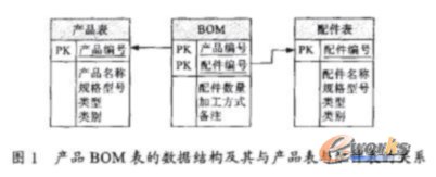BOM表達的是產品與零部件之間的關系,具體內容包括一個產品是由哪幾個零件或是部件組成,每個零部件又在這個產品中需要幾個。而在實際應用中,還要根據工廠的具體情況加上這個零件或是部件的加工方式(生產/外購)信息和備注信息。由于產品和配件都有可能有重復的名字,所以對產品和配件都進行了編號,具體每個產品和配件的其它信息要到產品表和配件表中進行查詢得到。所以,整個BOM表的實體屬性圖及其與產品表與配件表的關系如圖1所示。