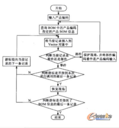 在Java2中的Vector類可以支持動態數組,并且可以將不同類型的對象(當然相同類型的對象更沒有問題)引用到Vector類的對象中去。Vector引用的對象存儲的是一條條BOM 信息,而不是一個個的ResultSet數據集,所以在構建Vector對象時就必須對每一次查詢得到的ResultSet數據集中的BOM信息進行重新處理,使數據集中的BOM信息能夠按照要顯示的1頃序在Vector對象中排列好。這是一個先序遍歷過程,具體操作過程流程如圖3所示。