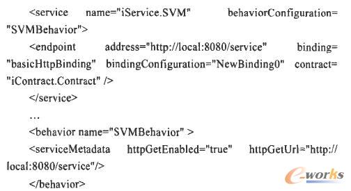 創建一個WCF服務并不復雜,當客戶端查找SVM服務時,可以請求此服務的配置文件(包含端點、服務合同),并將配置文件加載到本地應用程序中然后對服務進行消費。需要注意的是,客戶端調用時必須采用如下配置才能正確調用: