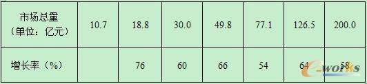 從上表中可以看出,從2007年市場總量約為10億元,經過連續7年高速增長,到2011年,市場總量已經增長為126億元的大市場。每年市場增長率均超過50%。預計,今年全年市場總量將達200億元。今年增長速度仍近60%。