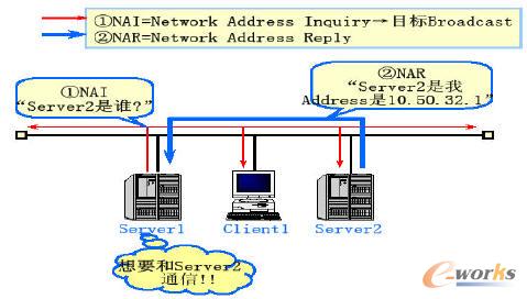 處在同一網(wǎng)段之間的兩個設(shè)備,在最初系統(tǒng)啟動的時候,其Node 名稱通過廣播包問詢的方式來進(jìn)行,當(dāng)一個設(shè)備(如server)需要訪問另一個設(shè)備時,是根據(jù)另一臺設(shè)備的Node 名稱來進(jìn)行訪問,正常情況下,ACE 的服務(wù)器端接口中會有需要通信的目標(biāo)Node 名的對應(yīng)地址,但是某些情況下,發(fā)送方可能不知道接收方的網(wǎng)絡(luò)地址,發(fā)送方就會向整個網(wǎng)段內(nèi)進(jìn)行廣播,接收方會將自身的網(wǎng)絡(luò)地址返回給發(fā)送方(見圖3-8),整個傳輸過程中不需要DNS 檢索和hosts 文件解析。發(fā)送方收到以后會將接收方的Node 名和對應(yīng)地址發(fā)送到ACE 的服務(wù)器端,這樣下次相同的通信就不需要再次進(jìn)行廣播查詢。