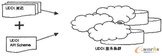 UDDI規范、XML Schema和UDDI注冊中心集群之間的關系如圖2-2所描述UDDI注冊中心集群能為Web服務提供一次注冊,到處發布的功能。