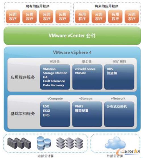 VMware vSphere是業界業界首款云計算操作系統,它利用虛擬化的強大能力將數據中心轉換為顯著簡化的云計算基礎架構,使IT組織能夠利用內部和外部資源,安全和低風險地提供新一代靈活可靠的IT服務。其軟件架構如下圖所示: