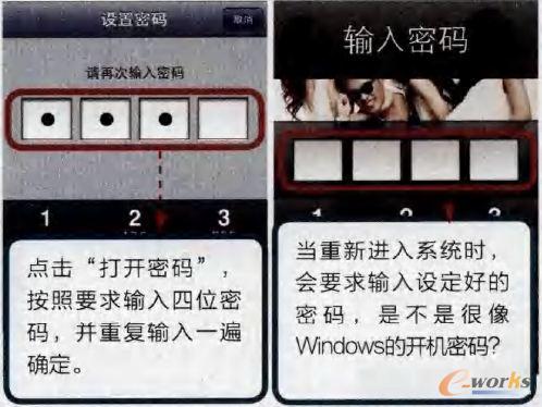 iOS系統也可以像Windows系統那樣設置“開機密碼”:進入“設置/通用/密碼鎖定”,點擊“打開密碼”,這時會要求輸入四位密碼,輸入好后,下次再想進入系統,就得先輸入預先設置好的密碼了。這樣就可以確保ios用戶的資料不被外人查看。如果想設置更復雜的密碼,可以關掉“簡單密碼”,設置更長的密碼,不過萬一自己忘了密碼,那可就麻煩了。