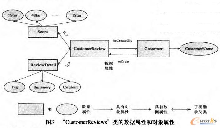 對象屬性主要用于約束類和類之間的關系。通常對象屬性的定義域為某個類,值域為某個類的某個實例。數據屬性主要用來描述類知識,它的定義域和對象屬性相同,值域是date、string、boolean、int、float、symbol、short、double、byte等。圖3中展示了生產線集成服務本體中“CustomerReviews”類的數據屬性和對象屬性。