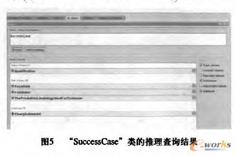 構建本體后,要對其進行推理,檢查本體的一致性,確定類能否添加實例。Protege嵌入了推理機(如FaCT++,HermiT1.3.5,Pellet),除了可以檢查本體的一致性,還可以通過“DL Query"查詢一個個體的父類、子類、兄弟類、相關類、實例等。以生產線集成服務本體為例,在對本體進行推理后,查詢”SuccessCase”類的父類結果為“Qualification”類,查詢其子類結果為“CaseDate”、”Customer”、”TheProductionLineInteratedForCustomer”,查詢其實例結果為”CheryAutomobil”,詳細如圖5所示。