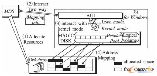存儲虛擬化系統按需分配功能設計如圖1所示,系統由元數據服務器MDS,客戶端軟件VA-forwindows以及磁盤陣列組成,三者由光纖通道相互連接組成帶外SAN架構,其中MDS負責從磁盤陣列中整合存儲資源并從中為按需分配卷分配存儲空間,構建邏輯地址與物理地址之間的映射關系,即映射表,VA-for windows 作為存儲虛擬化系統的客戶端軟件,由AUI和MAGICDISK兩個模塊組成,用戶態的AUI模塊負責從MDS接受虛擬化指令和映射表,并通過IOCTL與內核態進行信息交互;虛擬卷驅動模塊MAGICDISK在內核態負責接收來自AUI的虛擬化指令,并利用映射信息構建元數據存儲池以創建虛擬設備,即按需分配卷,在此基礎之上定制I/O訪問規則并完成邏輯地址到物理地址的映射,采用這種用戶態與內核態相結合的體系結構,將驅動程序中的通信請求從異步的I/O隊列中分離出來,由用戶態集中處理通信請求和指令交互,控制指令與數據傳輸相分離,可以有效地減小通信壓力,更好地發揮帶外SAN架構高速度、高帶寬的性能優勢。