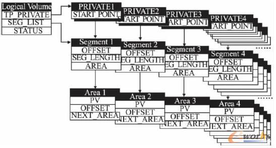 如上頁圖2所示,在按需分配卷的結構設計中,TP_PRIVATE域作為索引結構引導映射信息SEG_LIST域,可將其看作元數據存儲池的索引表,Segment結構包含已經分配的邏輯起始地址及長度,Area包含了與其對應的物理地址及偏移長度,因此從結構上Segment與Area是一一對應的關系.當新的映射關系到來時,將其中新的邏輯地址、物理地址以及索引信息添加進對應的鏈表結構中。