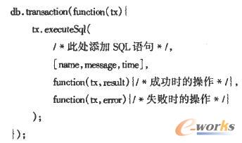 需要注意的是,函數(shù)具有一個事務類型的參數(shù)(tx),該事務參數(shù)具有一個函數(shù)executeSql(),包含SQL操作語句、相應的數(shù)據(jù)與時間、一個成功時執(zhí)行的函數(shù)和一個失敗時執(zhí)行的函數(shù)。