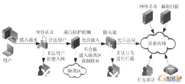 有些涉密內網對入網計算機未進行身份認證,繼而無法進行用戶身份合法性驗證。計算機只要設置了正確的網絡地址,在內網中任何一處網絡接入點即可接入內網。另外,內網中的服務器如果對外提供撥號接入服務,也有可能被非法用戶使用,使得外部計算機接入內部網絡。這些外部計算機一旦非法接入內網,即可正常訪問內網資源,對其中的涉密信息造成極大的威脅。