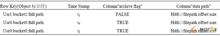 對象元數據存儲層主要利用HBase開源架構實現了對象元數據的管理等功能。HBase介于NoSQL和RDBMS之間,僅能通過主鍵(row key)和主鍵的range來檢索數據,僅支持單行事務。該模型的對象元數據存儲層共設計了三張表,分別是用于存儲對象元數據索引信息的索引容器表,索引容器表結構見表1,用于描述對象元數據信息的對象元數據表,對象元數據索引表見表2和描述用戶刪除的失效數據的已刪除數據表,已刪除數據表結構見表3。對象元數據存儲層建立在HBase之上,通過管理和維護這三張表實現了對象元數據的創建、查詢和刪除,以及小文件數據歸檔的功能。當訪問層提交創建數據請求后,系統會檢查訪問合法性和索引容器表的容量,如果索引容器表的容量不夠,將會創建一條新的對象元數據索引容器記錄。通過檢查后將對象元數據信息添加至對象元數據索引表,同時更新索引容器表的容量,最后將對象元數據存儲到HDFS文件系統中。當訪問層提交刪除數據請求后,系統會檢查訪問合法性,通過檢查后刪除對象元數據在對象元數據索引表中的索引信息,同時在已刪除數據表添加一條刪除數據記錄,更新索引容器表容量,進入數據歸檔周期時,系統將會刪除HDFS文件系統中的對象元數據。