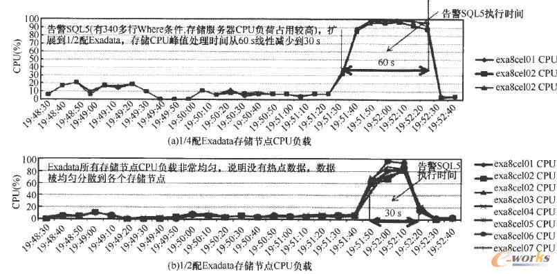 對(duì)于Exadata的數(shù)據(jù)庫云平臺(tái)擴(kuò)展能力測試,告警SQL5(CPU高負(fù)載SQL,SQL達(dá)34 KB)從1/4配(執(zhí)行時(shí)間0:01:08)擴(kuò)展到1/2配(執(zhí)行時(shí)間0:00:31)時(shí),可以明顯發(fā)現(xiàn)執(zhí)行時(shí)間線性減少(從68 8到31s),如圖13所示。